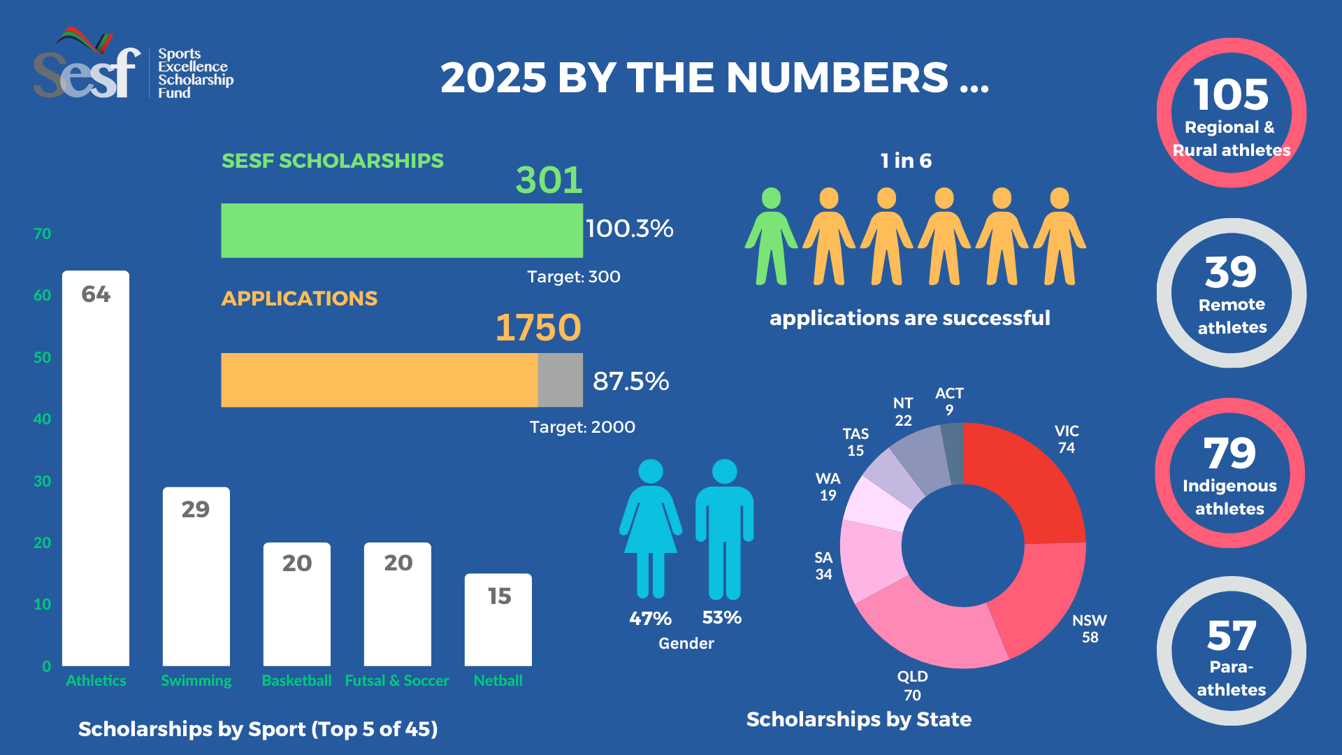 2025 was another record-breaking and milestone year for the SESF as we continue to support talented young athletes across Australia. We are proud to have awarded 301 scholarships to emerging athletes, from our goal of 300, from a total of 1,750 applications. This influx of demand reflects the expanding reach and reputation of SESF and highlights the pressing need for greater access to financial support in sport.